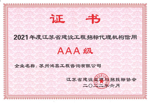• 2021年度江蘇省建設工程招標代理機構信用AAA級